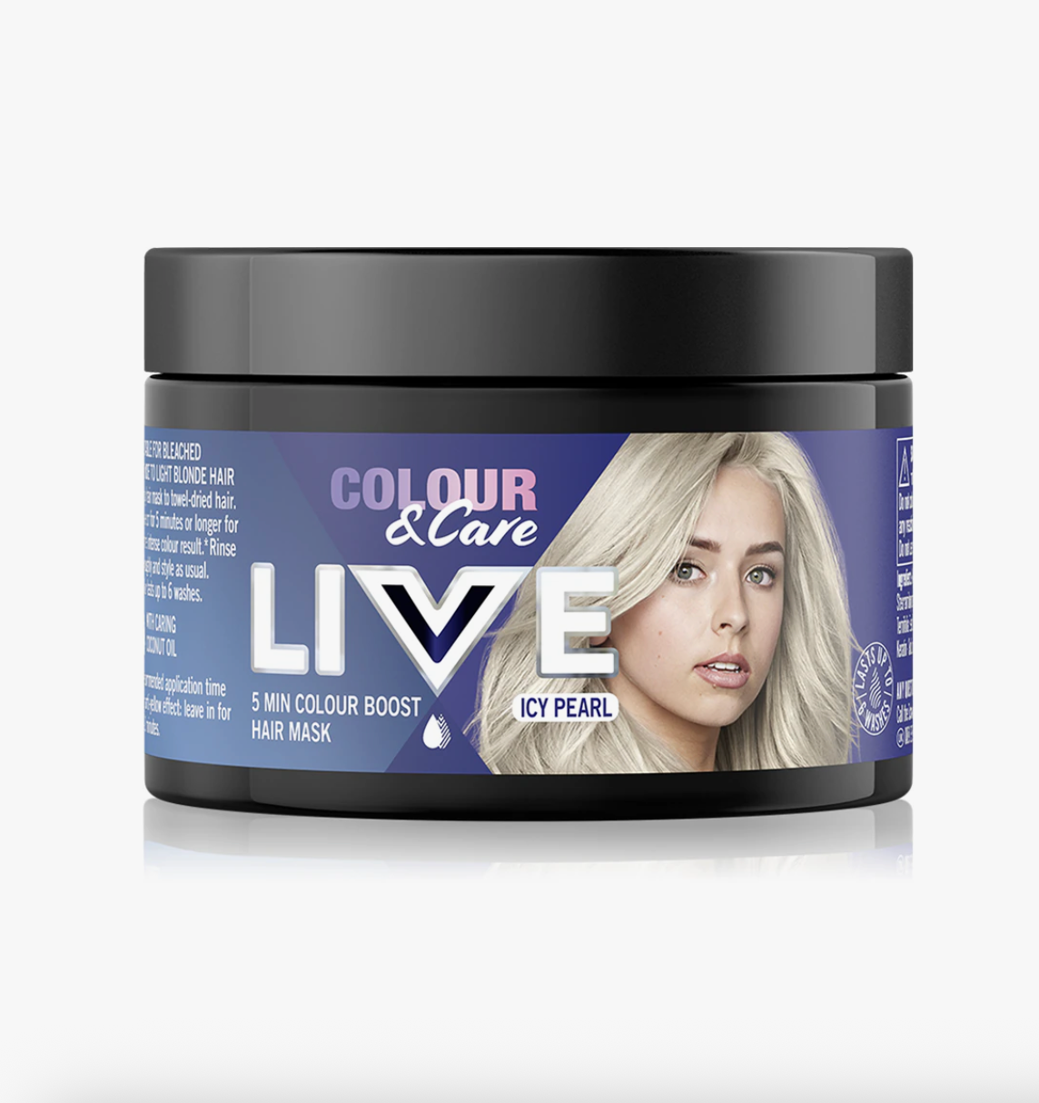 LIVE Colour & Care Hair Mask Colour Boost Icy Pearl is a 5 minute vegan formula hair mask designed to top up your hair colour and is suitable for bleached to light blonde hair. The formula which lasts up to 6 washes, has 3 effects in just 1 product: an anti-yellow effect to help neutralise unwanted yellow tones, a semi-permanent colour change for a pearly colour result and it reduces hair damage with caring coconut oil. Similar to silver or purple shampoos, it brightens your blonde, removes brassiness and delivers a beautiful shine.