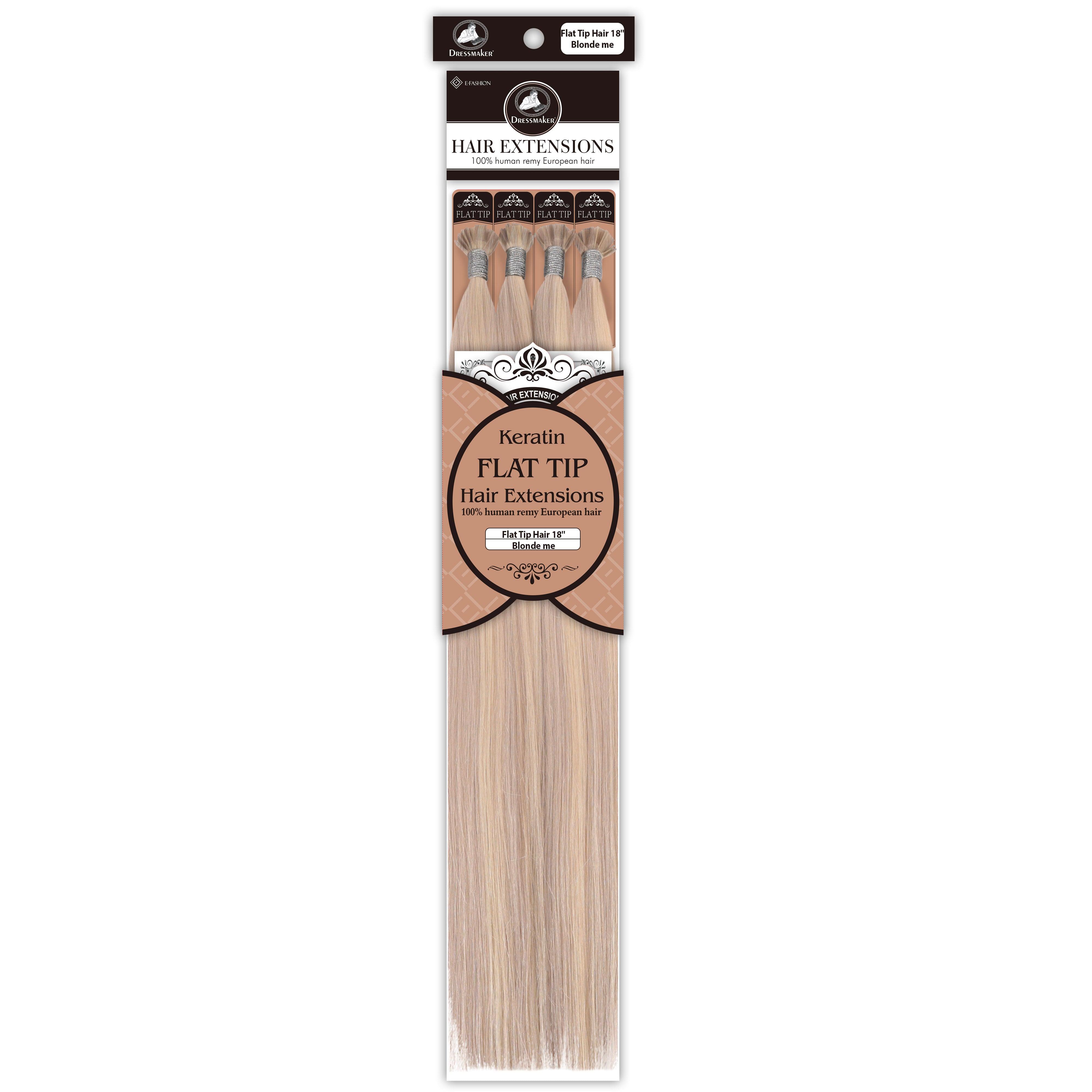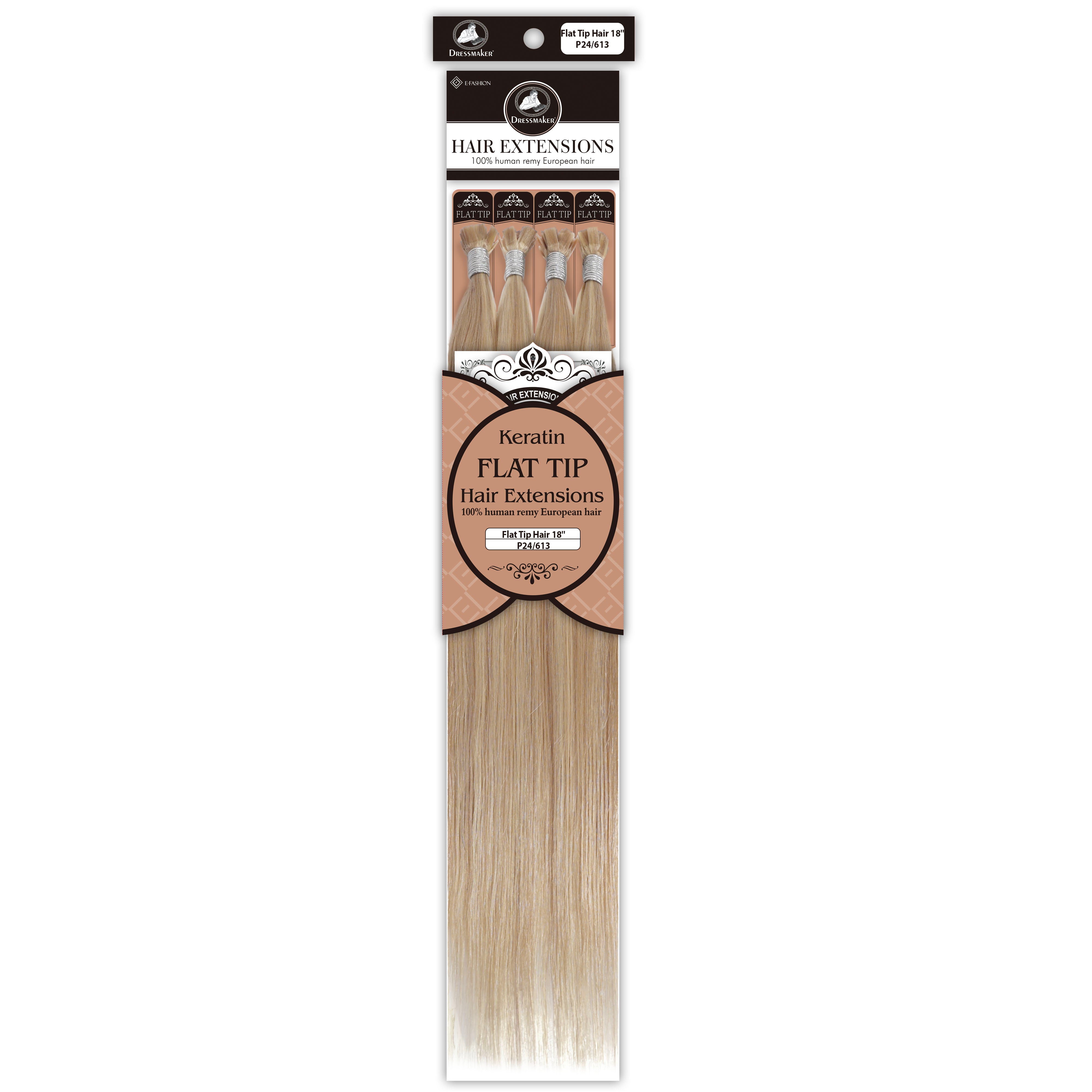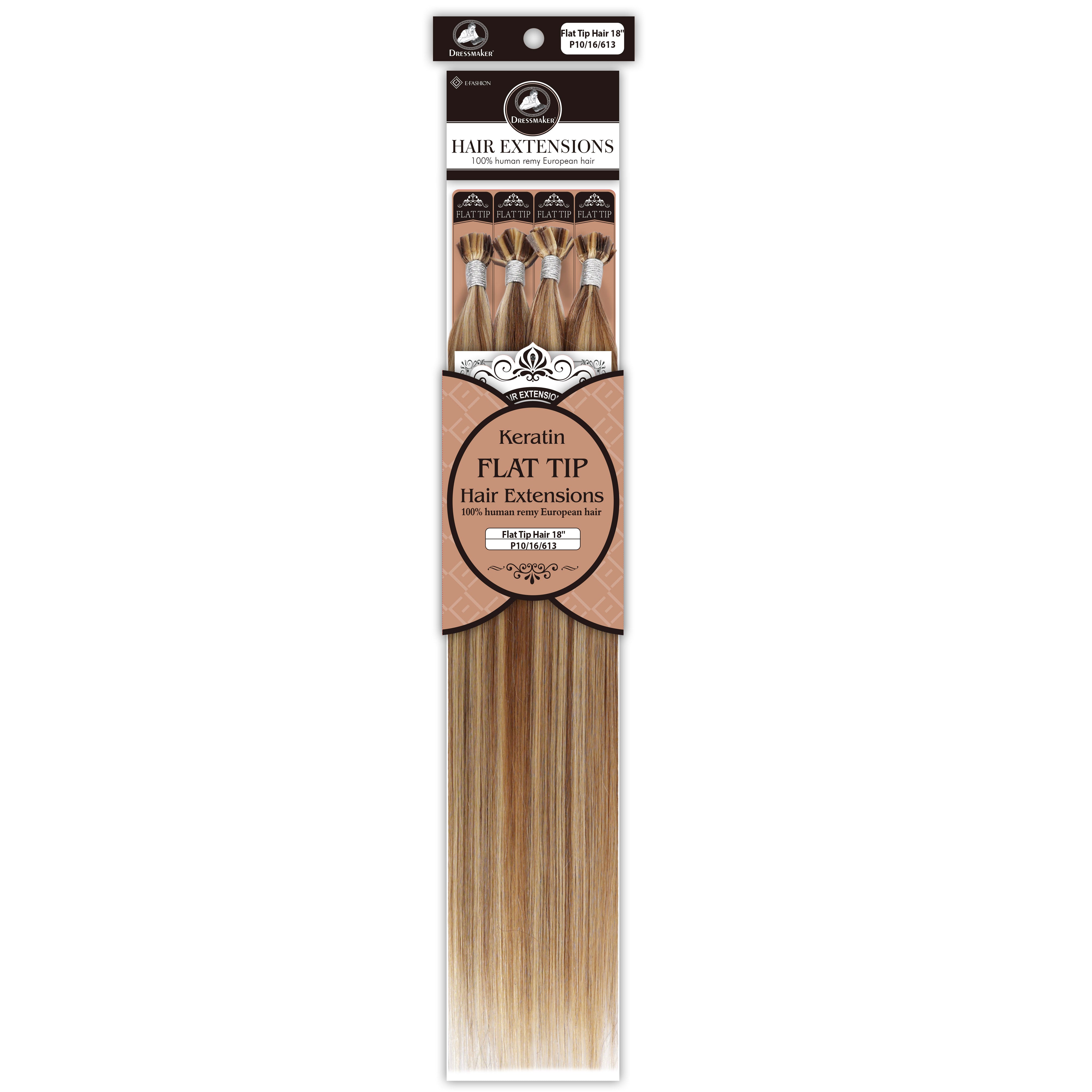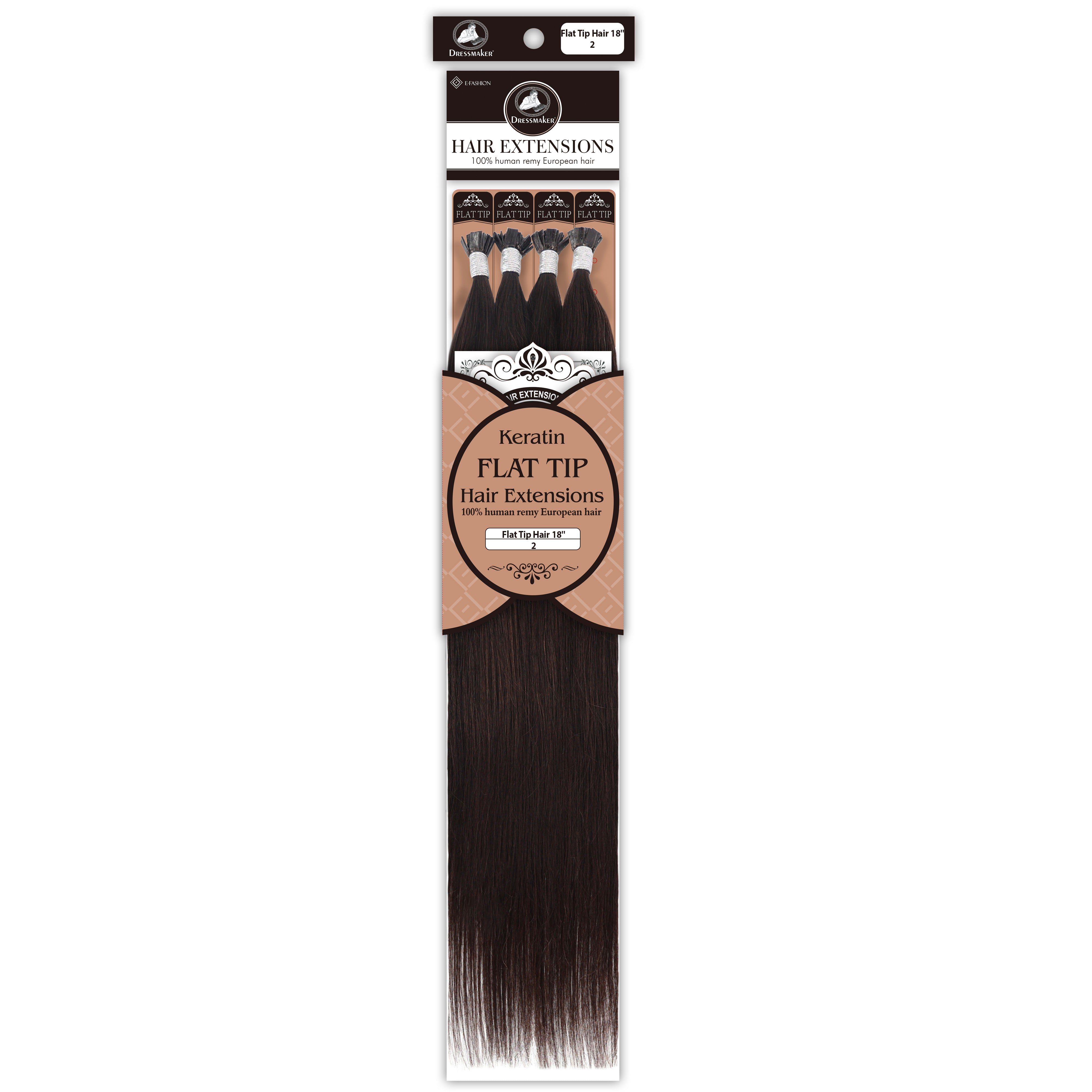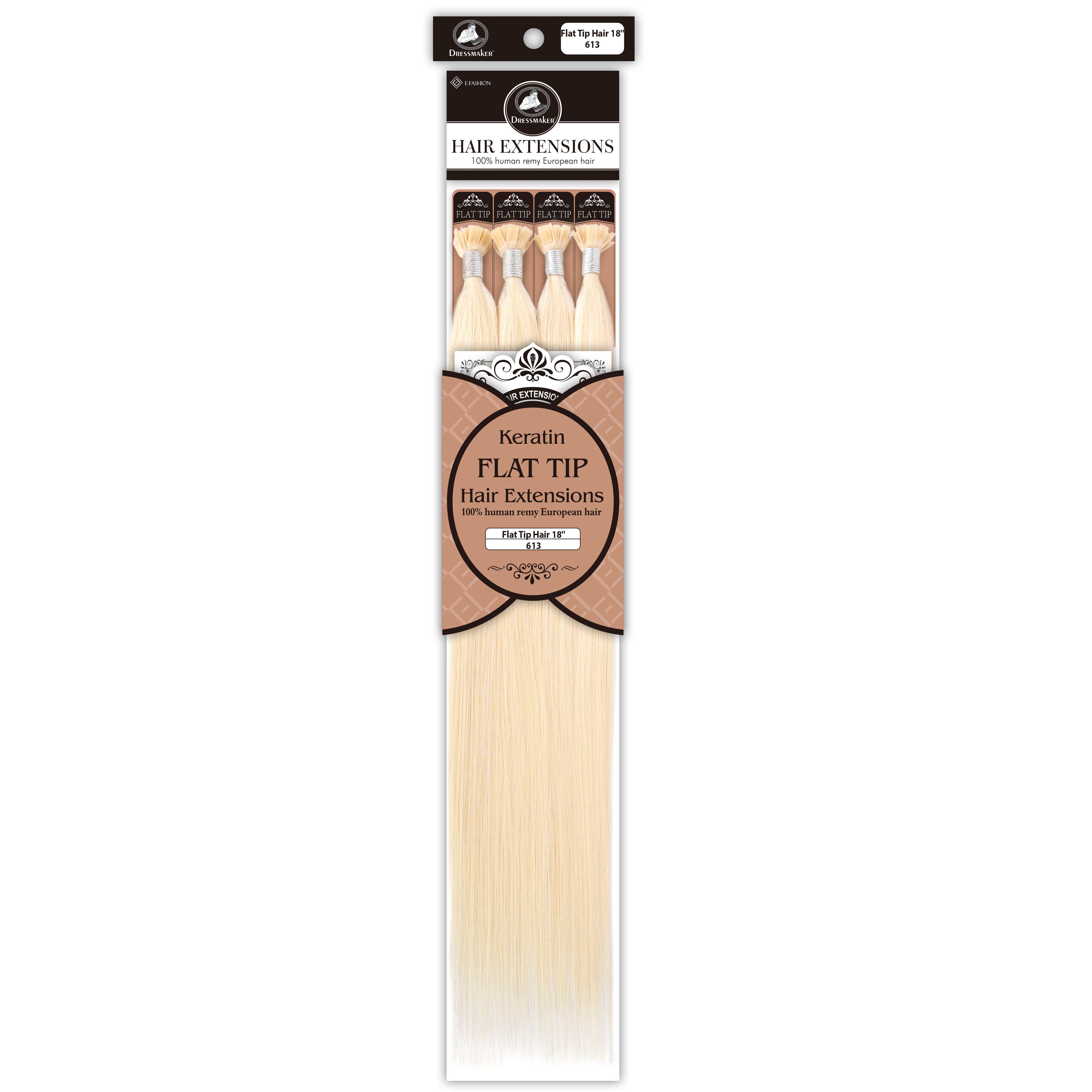 Dressmaker's 100% Human Remy European Keratin Flat Tip Hair Extensions are premium quality extensions designed to add length and volume to your hair. These extensions are straight and utilize keratin flat tip bonds, providing a secure and natural-looking attachment. Made from high-quality European Remy hair, these extensions offer a luxurious feel and a seamless blend with your natural hair.
