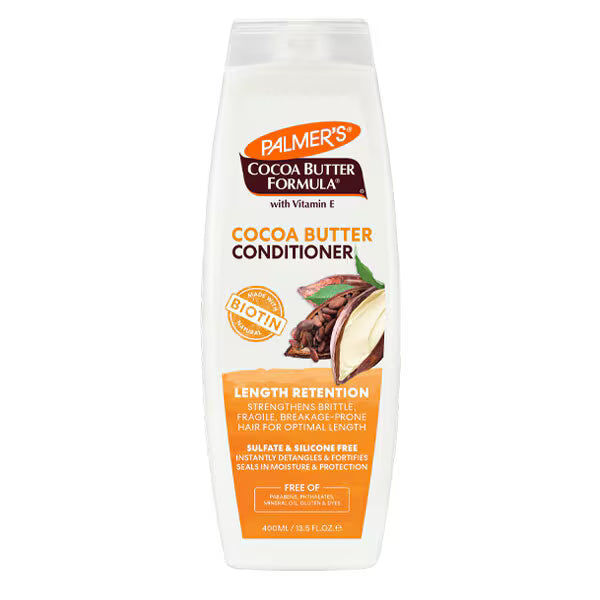 PALMER’S COCOA BUTTER FORMULA LENGTH RETENTION system with Biotin, fully strengthens hair with powerhouse natural protectants that help block brittleness, breakage and split ends to support optimal length.