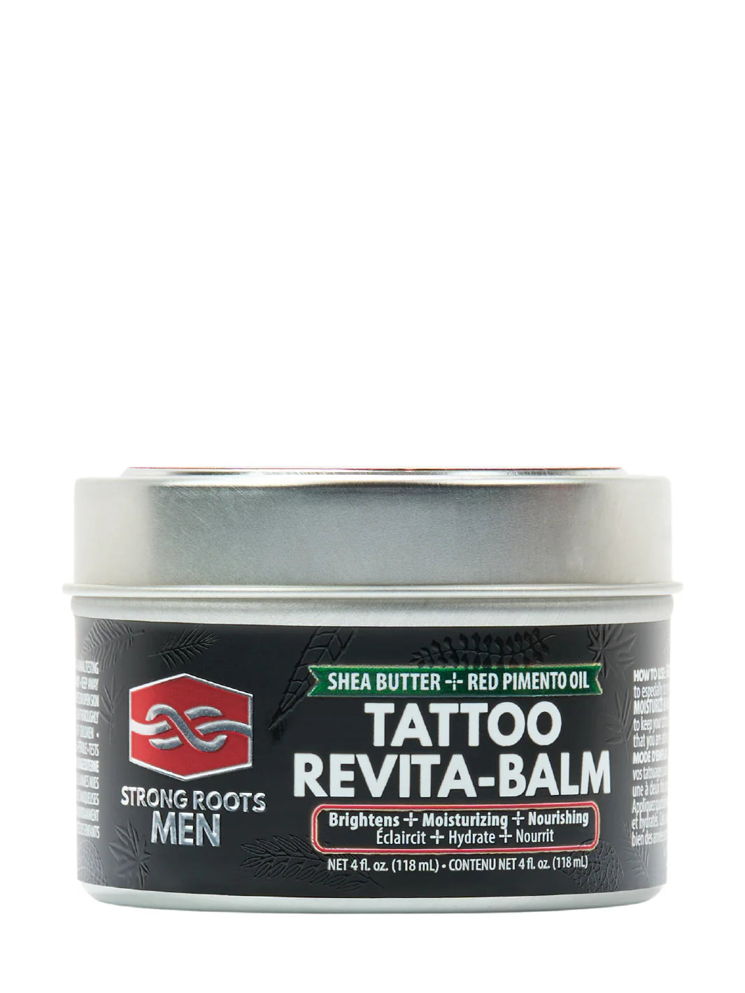 Strong Roots Men Tattoo Revita-Balm is uniquely blended with Jamaican Black Castor Oil infused with Shea Butter to revitalize, replenish, nourish, and preserve your body art with the all-natural formulation. It keeps your tattoos feeling fresh and looking vibrant long after you get them. Perfect for back, gray, or colored tattoos.