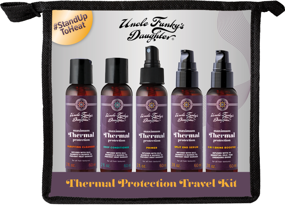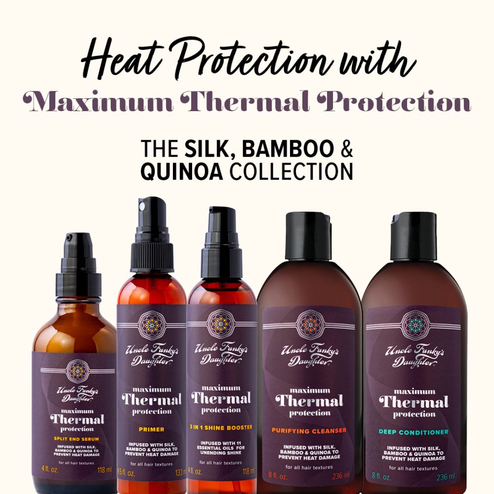 Protect your hair from heat with our TSA-approved Maximum Thermal Protection kit, crafted with a blend of silk, bamboo, and quinoa. Perfect for sampling our top picks on the go! Net weight 2 oz.